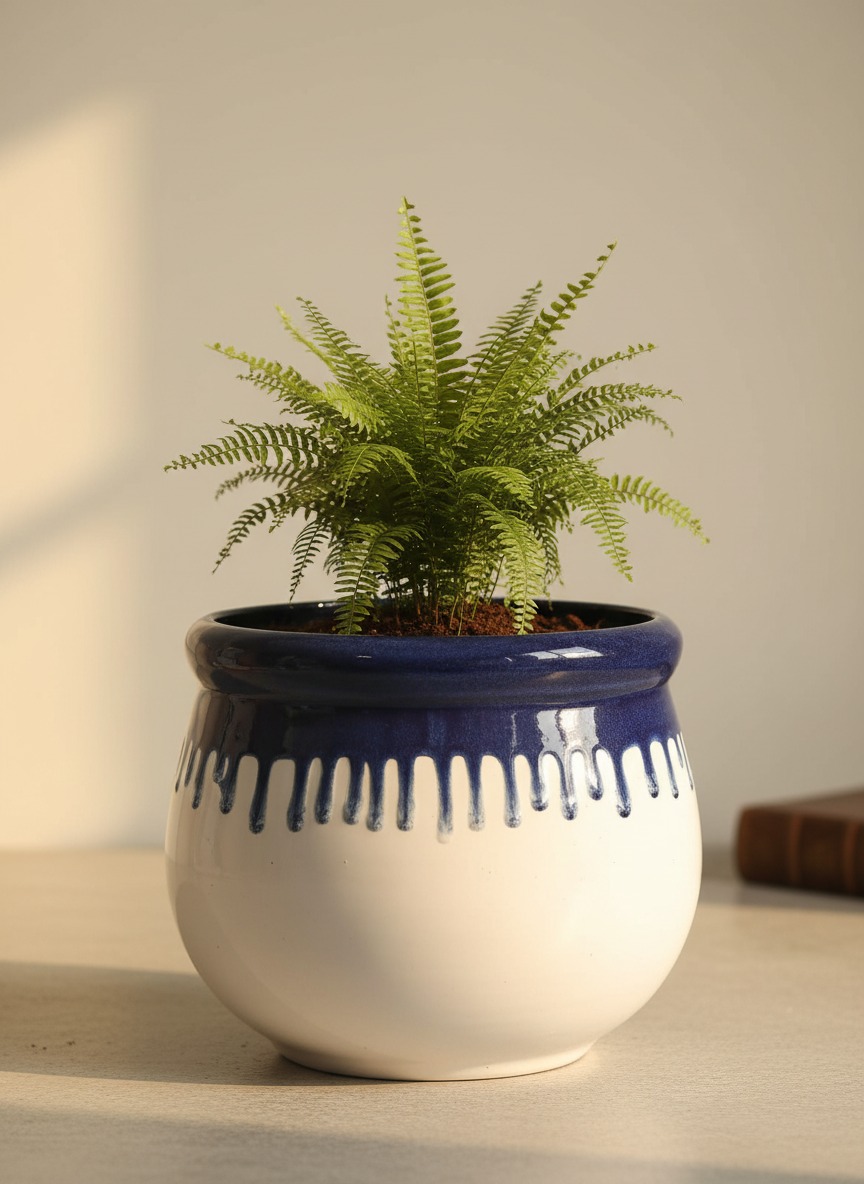 This elegant ceramic flower pot from Varaaya features a beautiful blue and white design. Perfect for displaying your favourite indoor plants, this pot will add a touch of sophistication to any room. Its unique drip pattern makes it a stylish addition to your home decor.