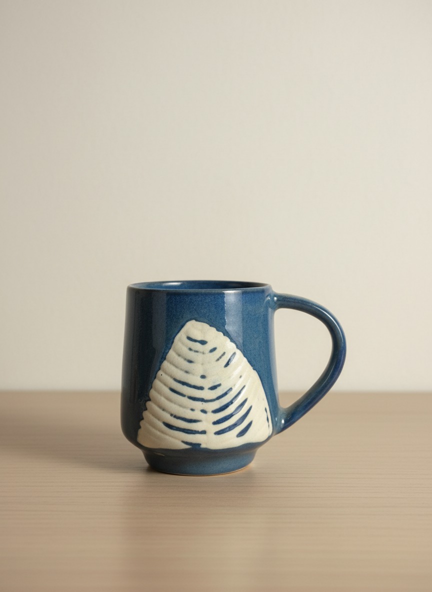 Blue ceramic mug with leaf design