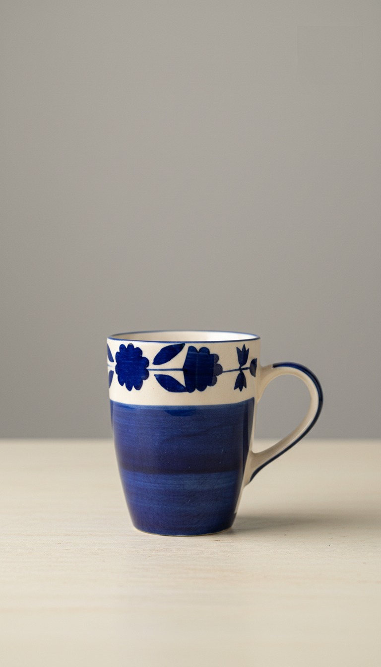 Enjoy your morning chai or coffee in this beautiful blue floral mug. The ceramic mug is designed with a traditional Indian floral pattern. This mug from Varaaya is perfect for everyday use.