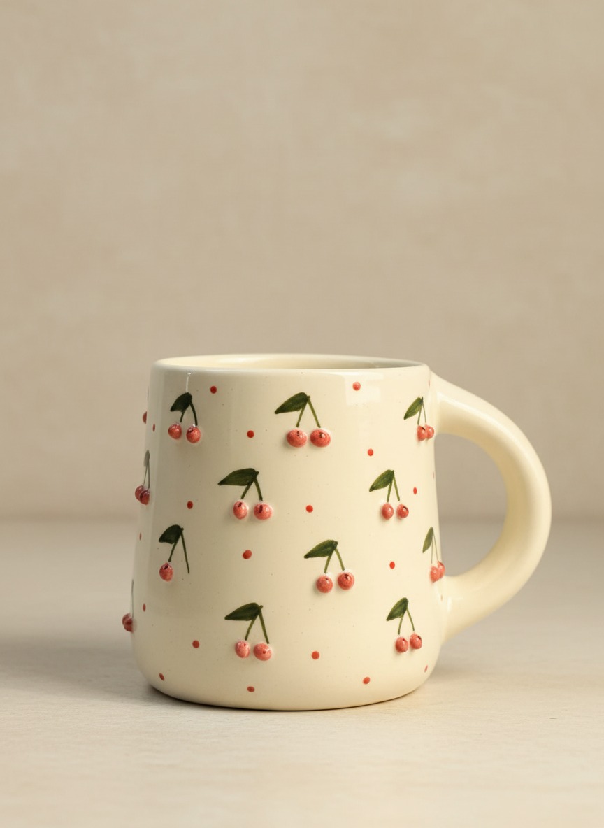 Enjoy your morning chai in this adorable cherry print mug. The design is sure to brighten up your day. This ceramic mug from Varaaya is perfect for hot or cold beverages.