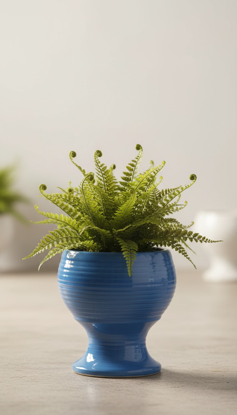 Add a touch of nature to your home with this beautiful fern. It comes potted in a stylish blue ribbed ceramic pot. This piece from Varaaya is perfect for adding greenery to any room.