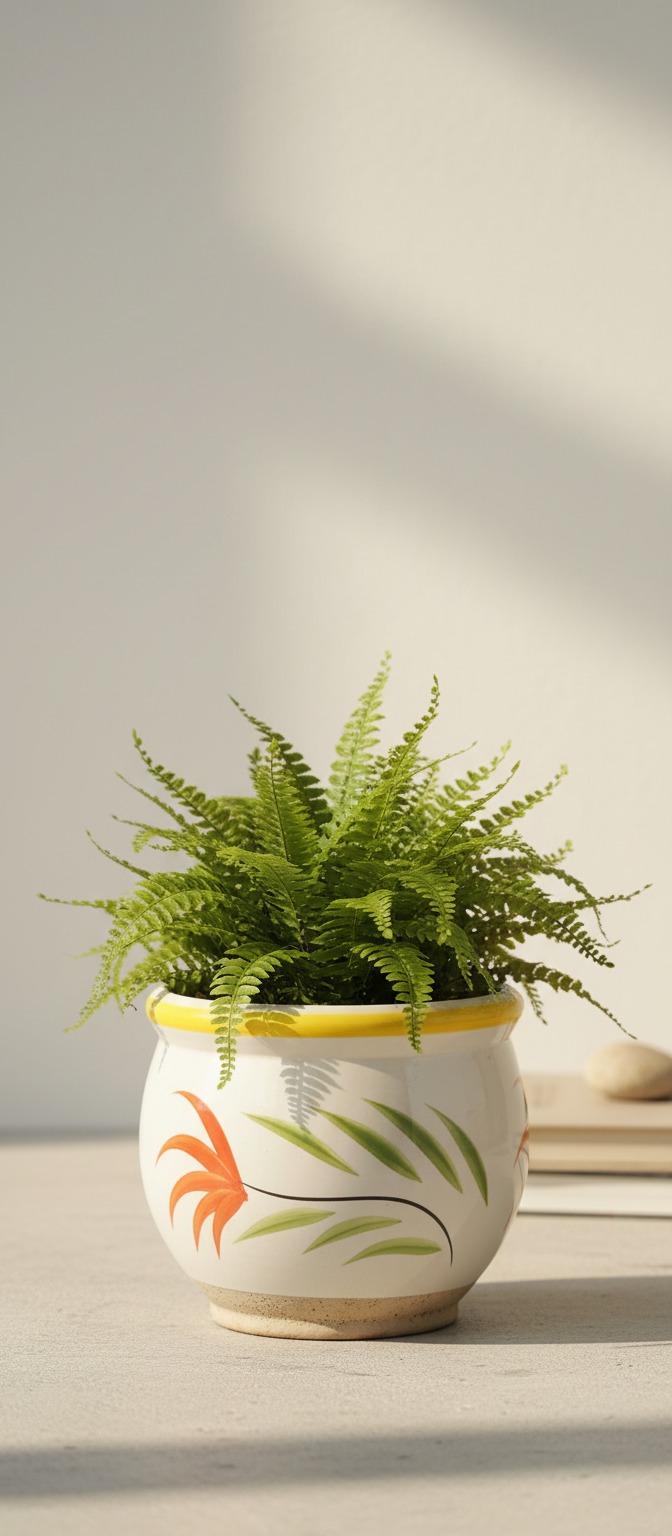 Fern plant in floral ceramic pot