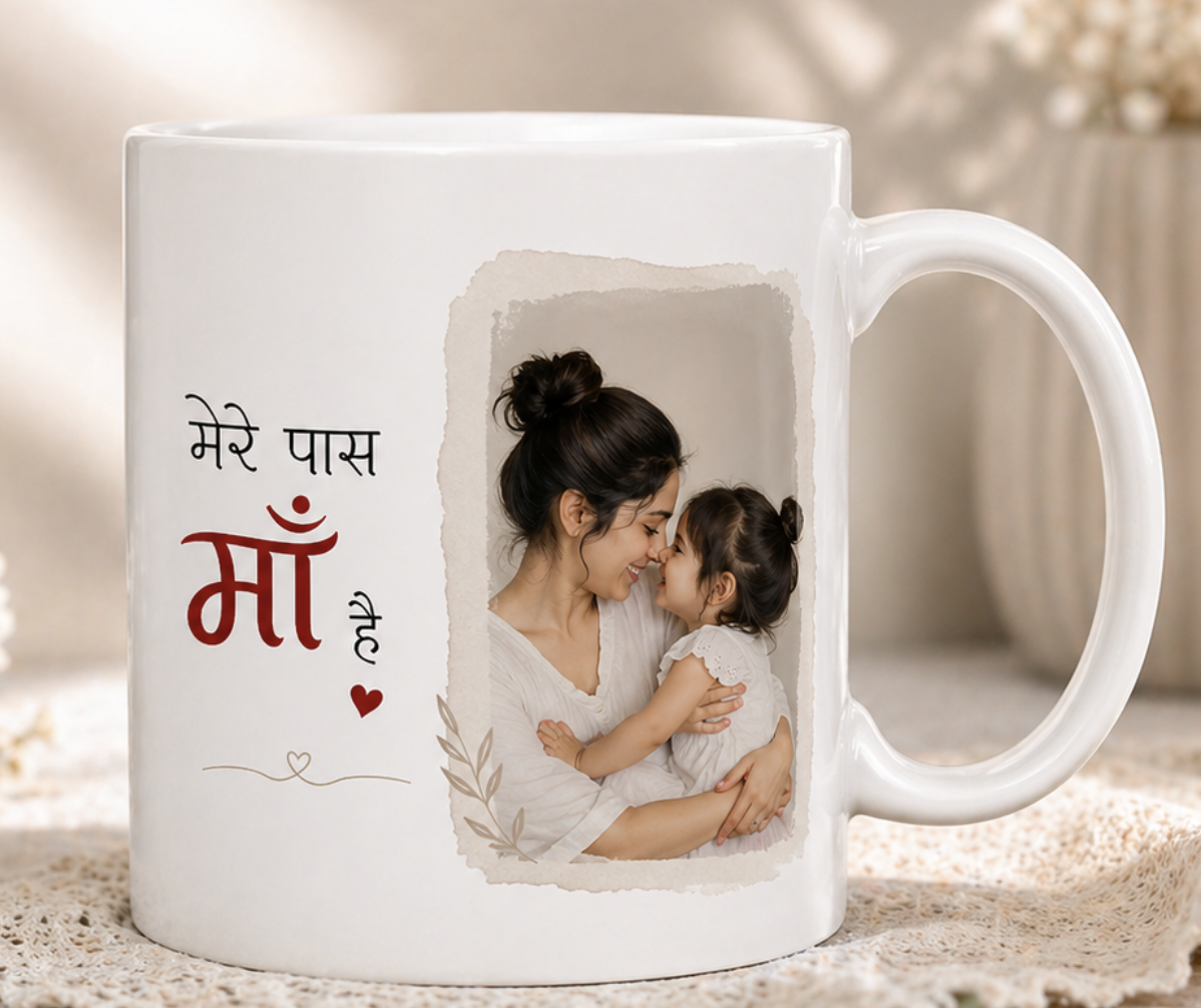 The most touching gift — a personalised mug with the beloved Hindi phrase "मेरे पास माँ है" and your favourite photo of you and your mom. A keepsake she'll treasure with every sip.