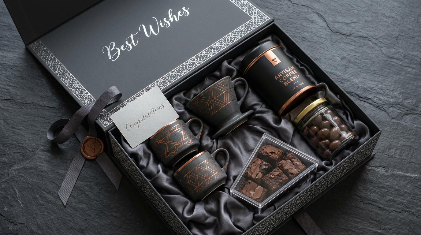 **Hamper contains:** - 2 x Modern stoneware coffee cups (charcoal with copper geometric patterns) - Ceramic pour-over coffee dripper (matching design) - Artisan coffee blend tin (matte black with copper accents) - Glass jar of dark chocolate-coated almonds (gold lid) - Transparent box of chocolate brownie chunks (fudge style) - Congratulations card - Dark grey silk filler, charcoal ribbon, copper wax seal **Box:** Charcoal grey with silver geometric lattice **Personalise:** Choose your box colour, pattern (Paisley, Mandala, Jali & more), add a custom message and your own photo or logo on the box lid. --- Varaaya curates these hampers independently. Contents may vary by season and availability; confirm exact items when ordering. Fulfilment uses Varaaya's inventory and substitutions where needed.