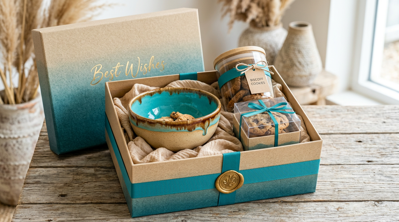 **Hamper contains:** - Handcrafted ceramic bowl with turquoise glaze — sandy beige base, brown drip rim (Varaaya Serving Essentials) - Glass jar of Biscoff cookies — natural wood lid, teal accent band - Transparent box of chunky chocolate chip cookies — clear lid, sand-kraft base - Congratulations card - Sand-beige silk crinkle filler, teal grosgrain ribbon, gold wax seal **Box:** Sand & teal ombré wrap panel with matte kraft interior **Personalise:** Choose your box colour, pattern (Paisley, Mandala, Jali & more), add a custom message and your own photo or logo on the box lid. --- Varaaya curates these hampers independently. Contents may vary by season and availability; confirm exact items when ordering. Fulfilment uses Varaaya's inventory and substitutions where needed.