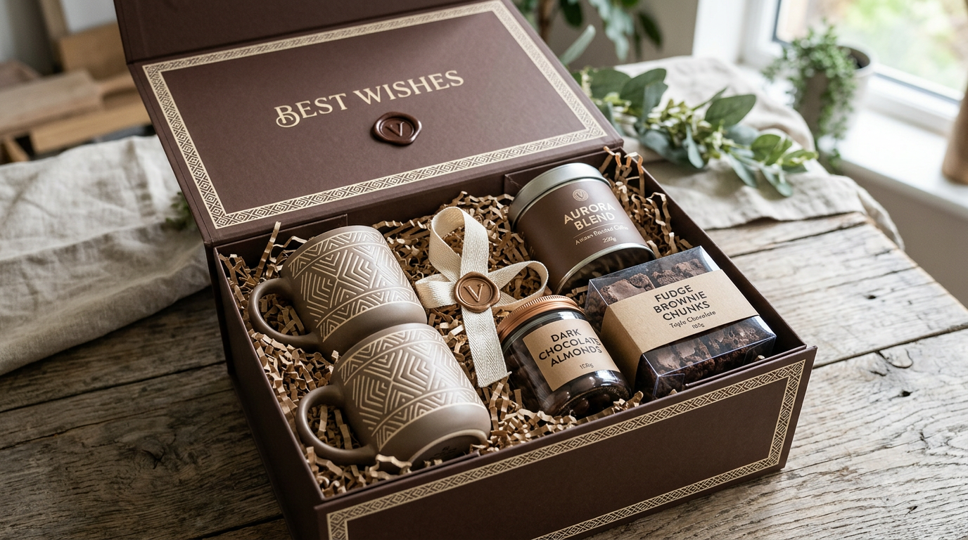**Hamper contains:** - 2 x Earthy Brown Ceramic Coffee Mug with Design 330ml (matte taupe, cream geometric etch — Varaaya Cups & Mugs) - Glass jar of dark chocolate-coated almonds — brushed bronze lid, matte cocoa label - Transparent box of brownie chunks — smoke base, kraft sleeve - Artisan coffee blend tin (matte brown kraft wrap) - Congratulations card - Shredded kraft filler, cream cotton ribbon, matte bronze seal **Box:** Deep cocoa kraft with cream geometric line border **Personalise:** Choose your box colour, pattern (Paisley, Mandala, Jali & more), add a custom message and your own photo or logo on the box lid. --- Varaaya curates these hampers independently. Contents may vary by season and availability; confirm exact items when ordering. Fulfilment uses Varaaya's inventory and substitutions where needed.