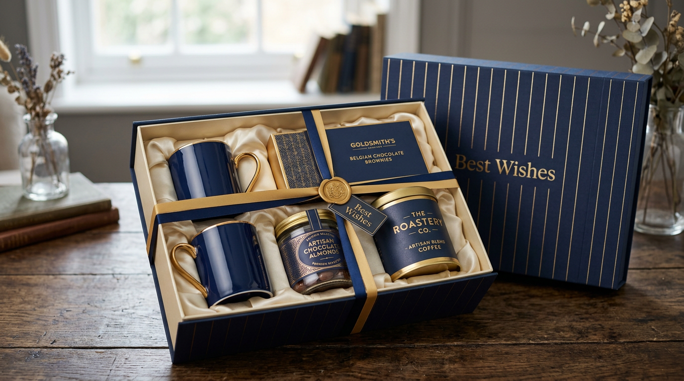 **Hamper contains:** - 2 x Elegant Blue Coffee Mug with Gold Trim 300ml (gloss navy, gold rim — Varaaya Cups & Mugs) - Glass jar of dark chocolate-coated almonds — gold lid, navy label - Transparent box of brownie chunks — navy base tray, gold foil accent - Artisan coffee blend tin (navy & gold) - Congratulations card - Champagne silk filler, navy & gold dual ribbon, wax seal **Box:** Midnight navy with gold foil pinstripe; ivory interior **Personalise:** Choose your box colour, pattern (Paisley, Mandala, Jali & more), add a custom message and your own photo or logo on the box lid. --- Varaaya curates these hampers independently. Contents may vary by season and availability; confirm exact items when ordering. Fulfilment uses Varaaya's inventory and substitutions where needed.