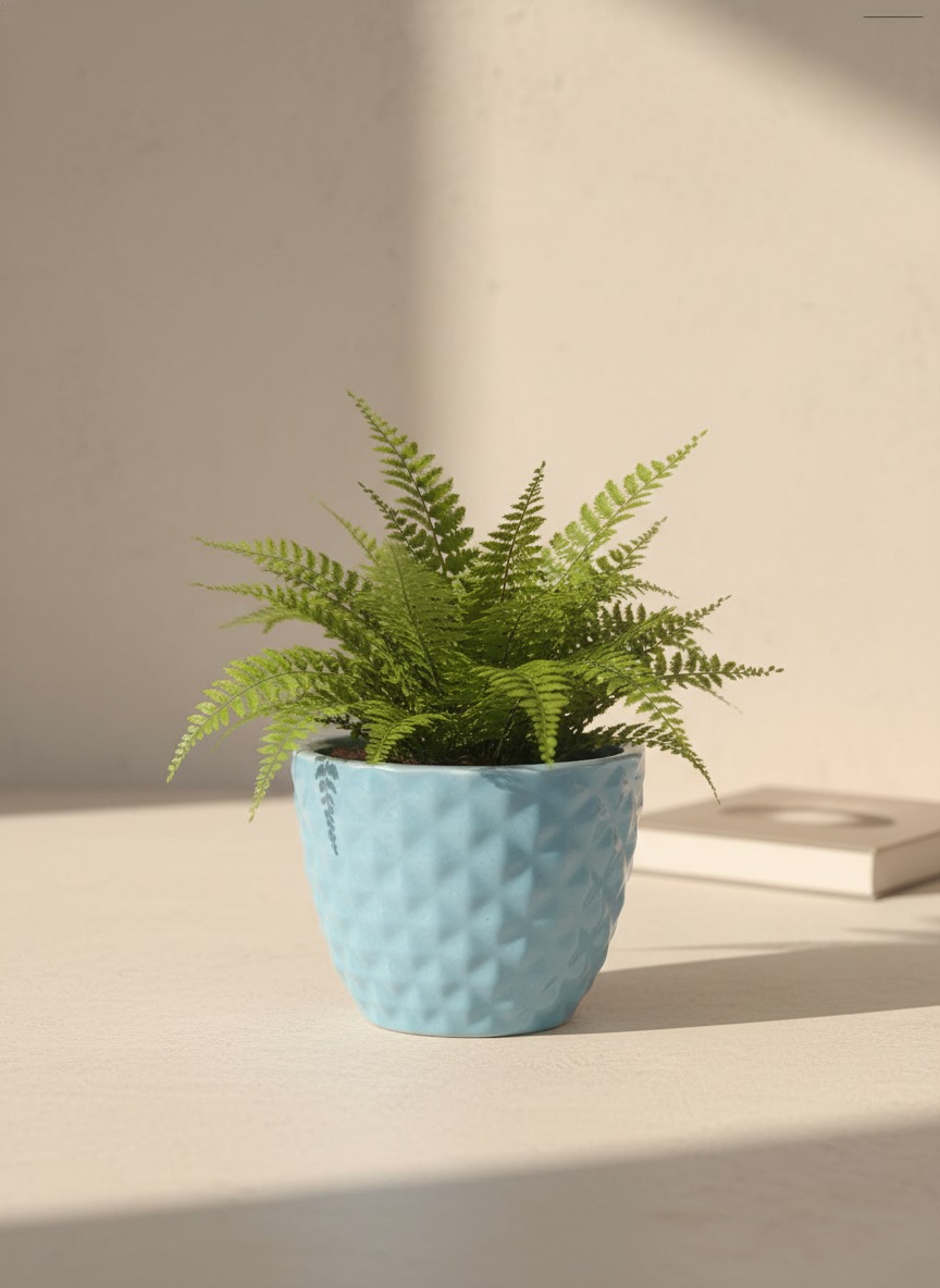 This lovely fern, potted in a textured light blue ceramic pot, is a perfect accent for your home. A simple way to bring a bit of the outdoors inside, this piece from Varaaya can brighten any space.