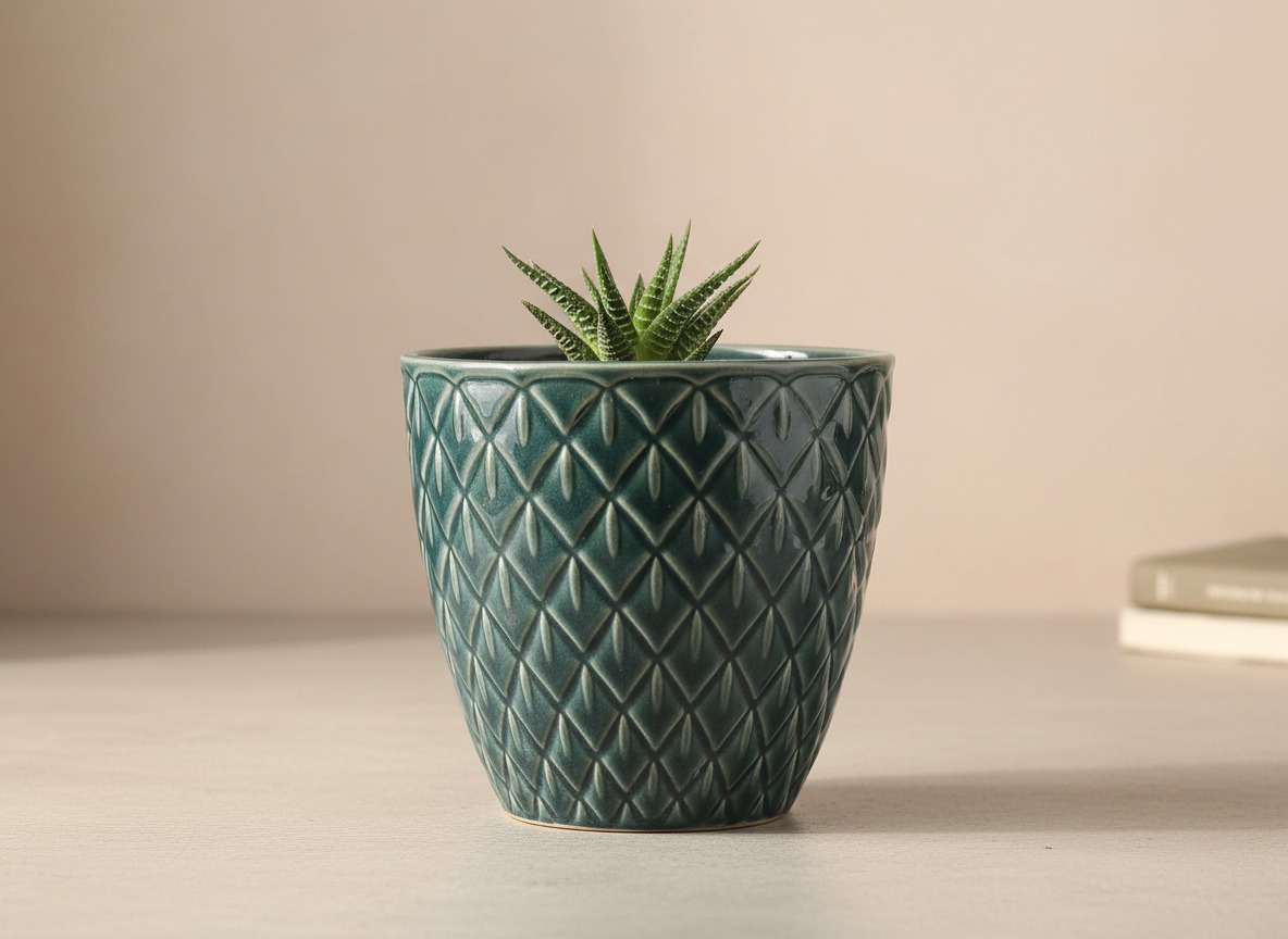 This teal planter pot features a beautiful diamond pattern. It is perfect for adding a touch of elegance to your home or office. Consider this piece from Varaaya for your indoor plants.